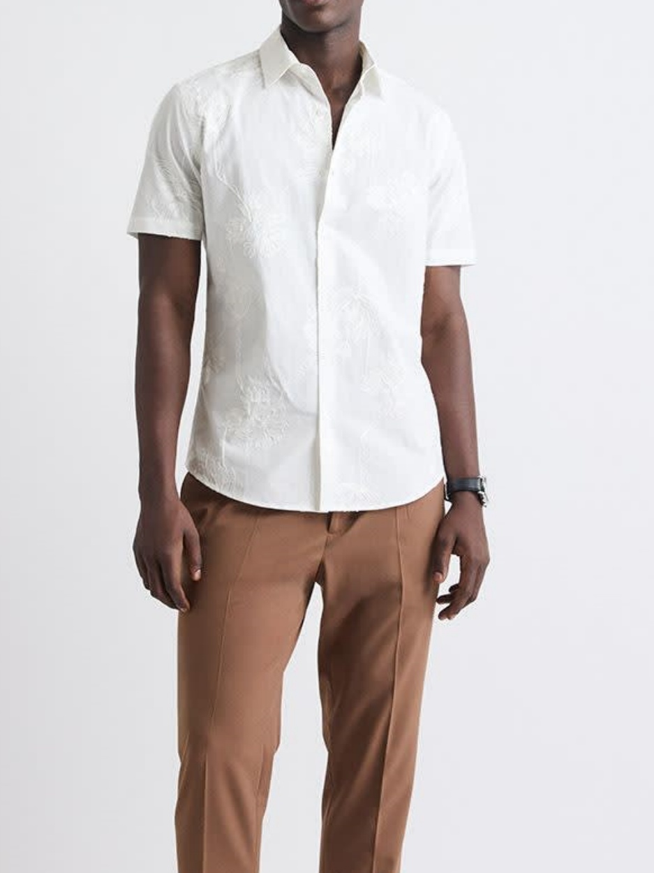 Bright white Tailored-Fit Dress Shirt with Floral Embroideries