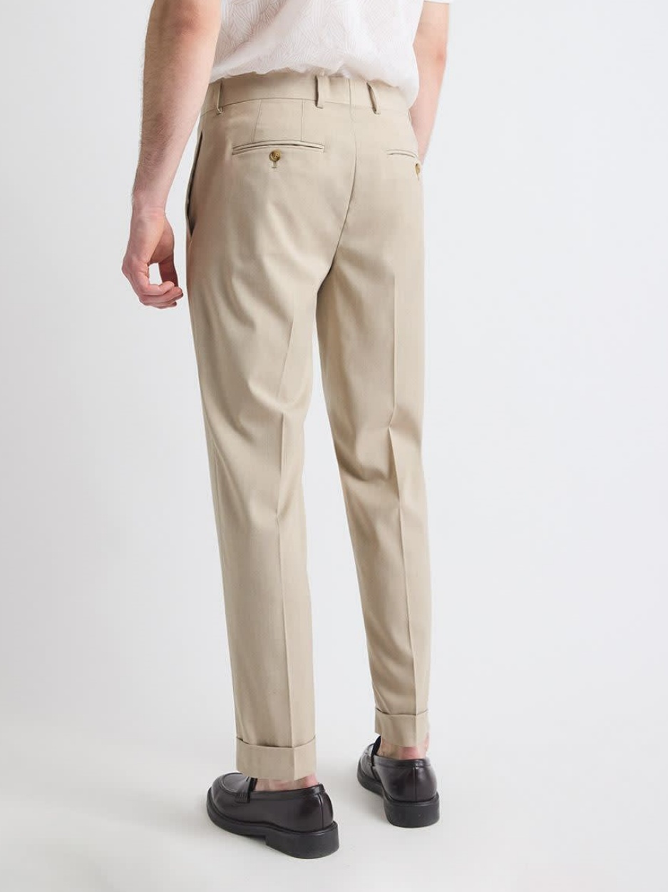 Featuring trendy rolled cuffs, this tapered-leg beige pant is a timeless piece to add to your wardrobe, perfect for both formal and smart-casual occasions. Matching blazer available.